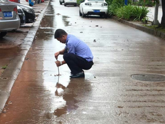 ▲公司管理人員能動(dòng)性強(qiáng)協(xié)助環(huán)衛(wèi)工人清理堵塞下水道